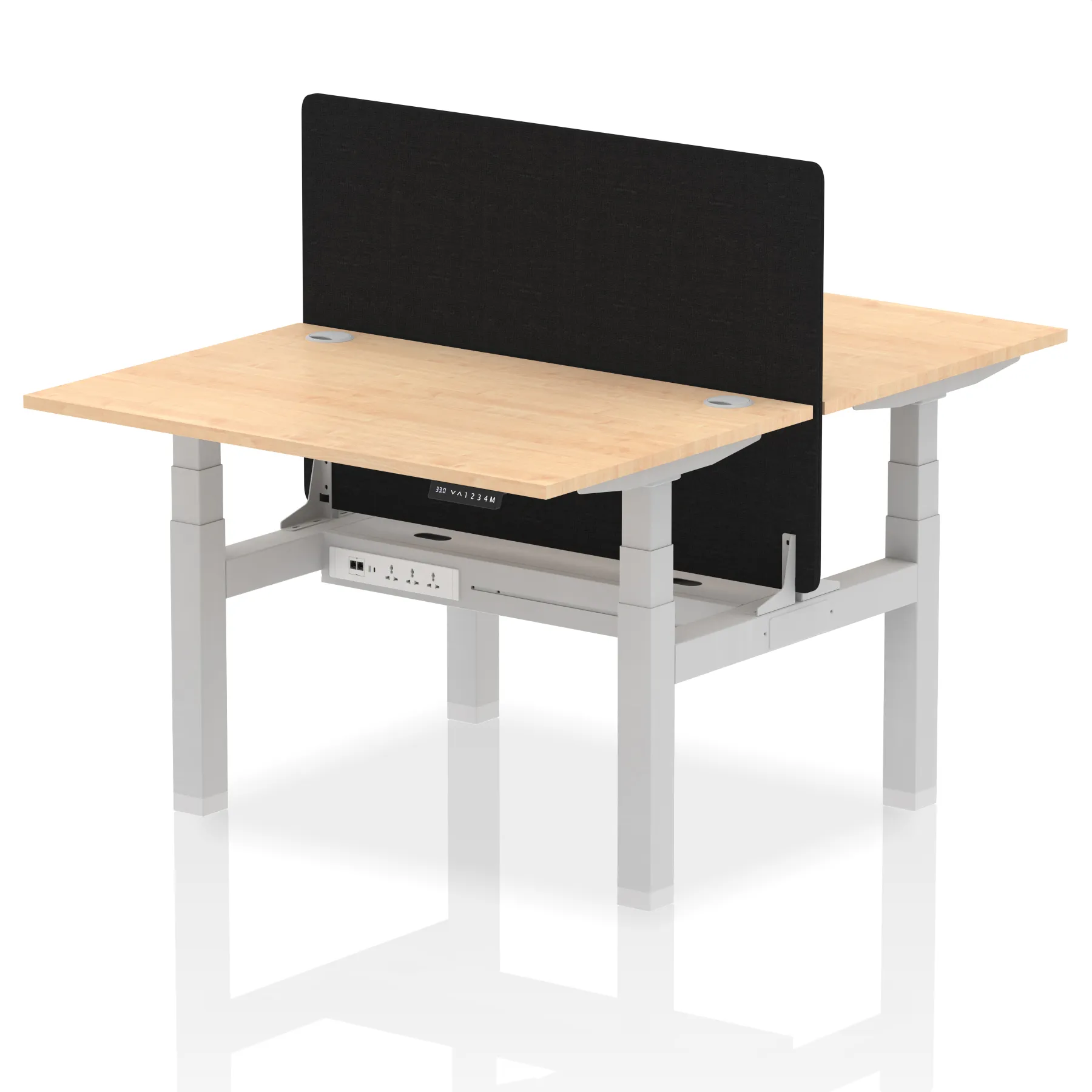 Elevate your office with the Air Back-to-Back Height Adjustable Desk for two, a blend of ergonomics and connectivity. Each desk includes two Ethernet ports, a USB and USB-C port, and three UK plugs, complemented by integrated cable ports for a clean setup. The addition of a straight screen offers privacy and focus. This desk is a perfect match for professionals seeking a tidy, tech-friendly, and adaptable workspace.