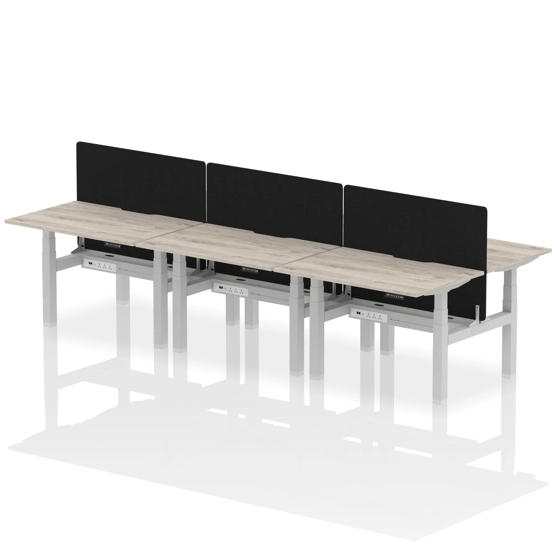 Experience cutting-edge collaboration with the Air Back-to-Back Height Adjustable Desk for six, featuring a unique scalloped edge design and a dividing screen per duo. Each desk is outfitted with two Ethernet ports, a USB port, a USB-C port, and three UK plugs, ensuring unparalleled connectivity. The adjustable height caters to ergonomic needs, making it perfect for dynamic teams who prioritize both style and functionality in their workspace.