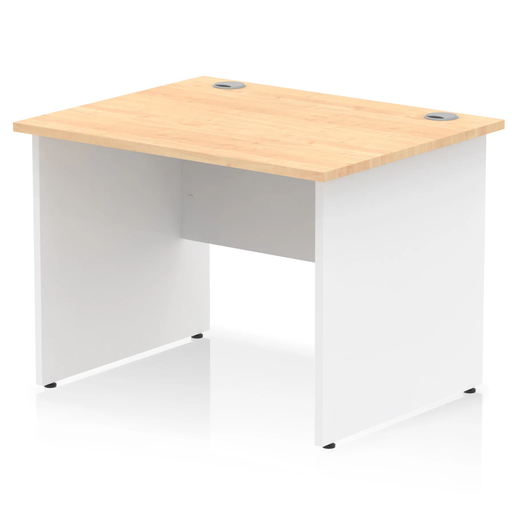 Impulse contract desk | 25mm tops | Heat resistant melamine finish | 18mm modesty panel | 2mm protective abs edging | Matching wood panel end legs | 2 cable ports | Height adjustable feet | Steel to steel fixings | 2 modesty panel slots | Deep set modesty panel (5″) allows for compatibility of most screen clamp fittings | Weight Capacity 135Kg