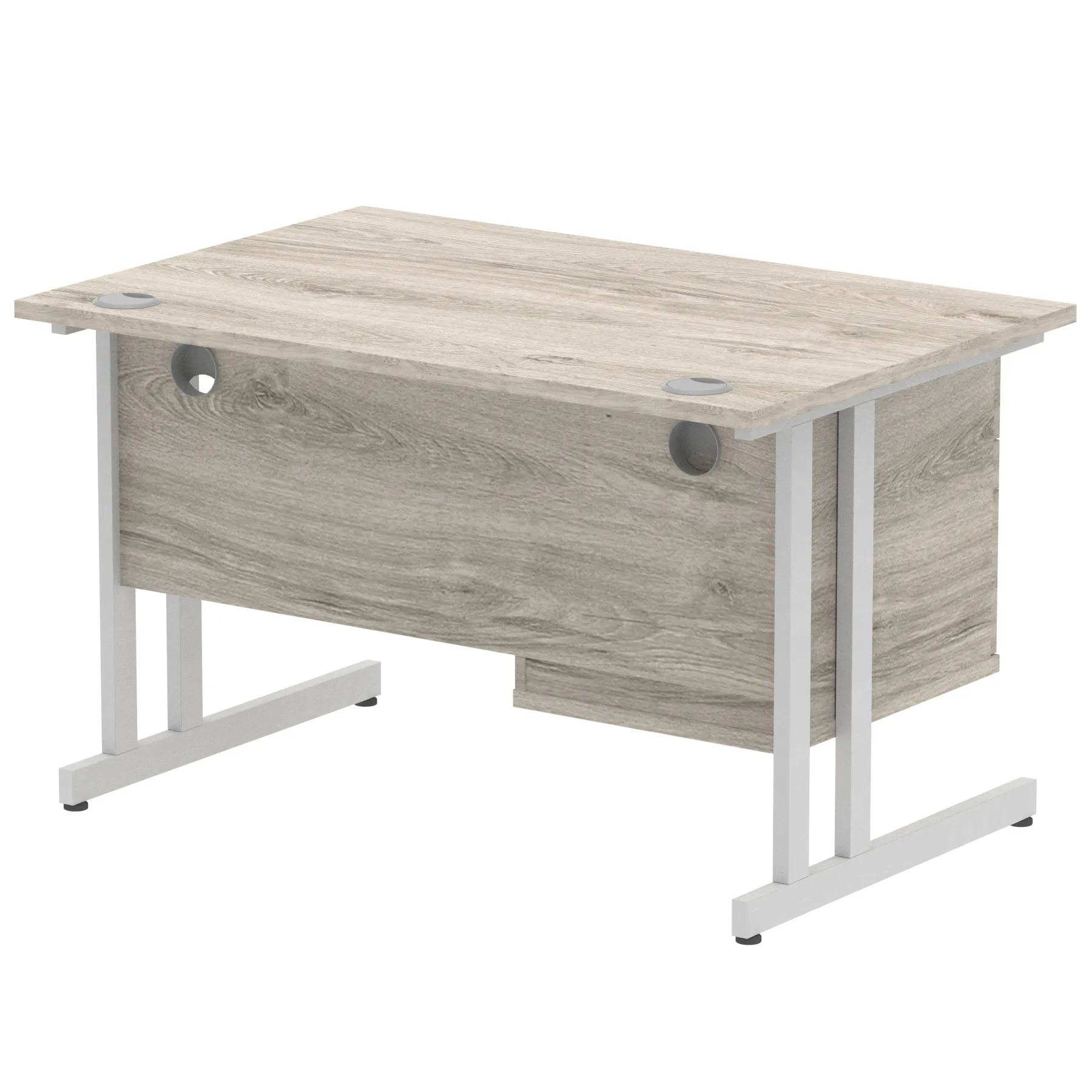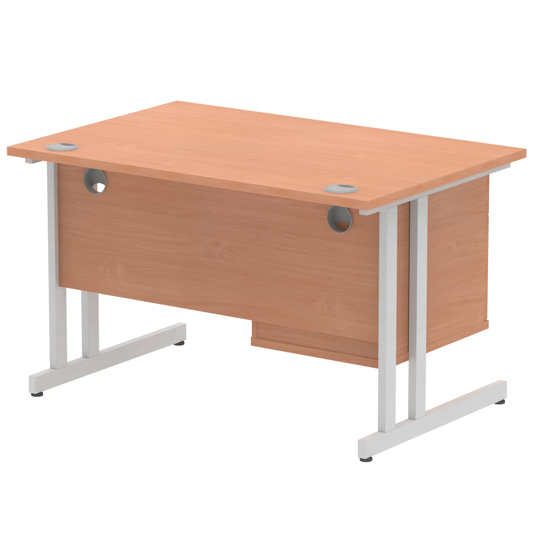 • Impulse contract 1200 wide desk • 25mm tops • Heat resistant Beech melamine finish • 18mm modesty panels • 2mm protective abs edging • White coated double strut legs • 2 cable ports • Height adjustable feet • Steel to steel fixings • 2 modesty panels slots • Deep set modesty panel (5”) allows for compatibility of most screen clamp fittings • Fixed pedestal