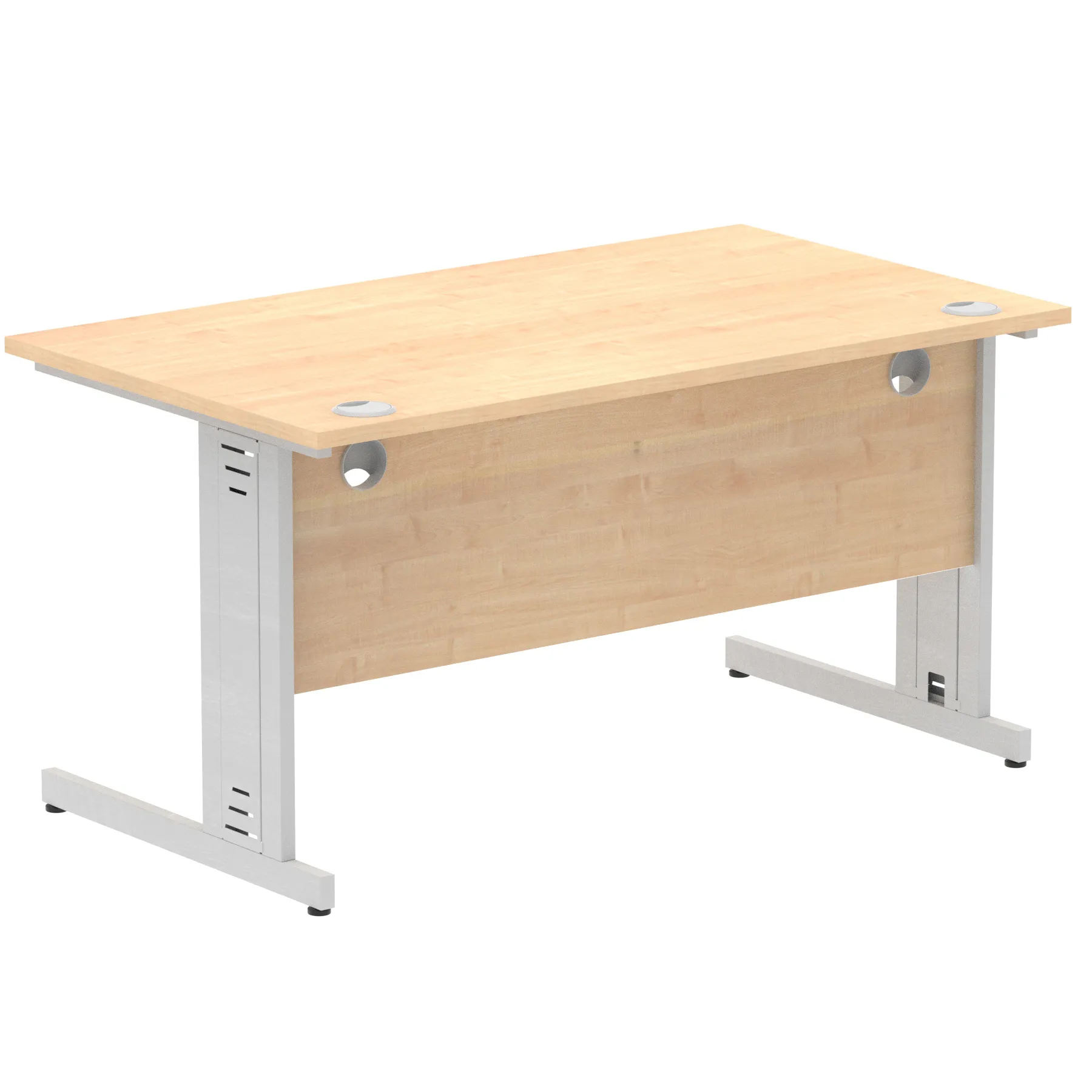 Impulse contract desk | 25mm tops | wire management panel | Heat resistant melamine finish | 18mm modesty panel | 2mm protective abs edging | Silver coated double strut legs | 2 cable ports | Height adjustable feet | Steel to steel fixings | 2 modesty panel slots | Deep set modesty panel (5″) allows for compatibility of most screen clamp fittings | Weight Capacity 135Kg