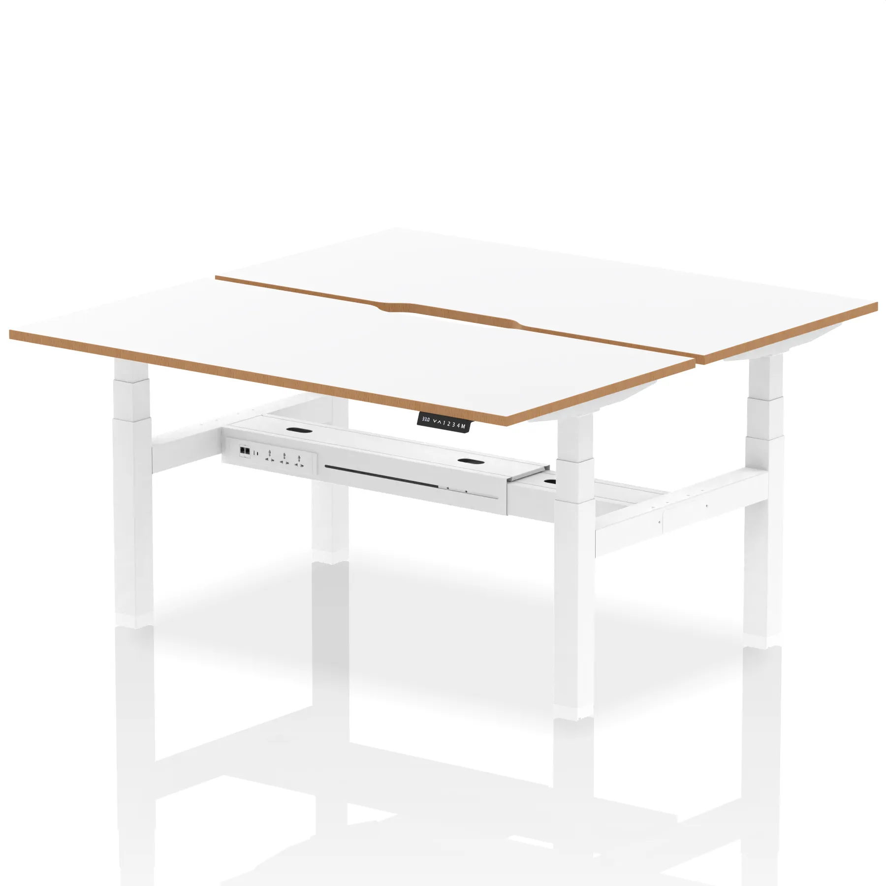 Elevate your office with the Air Back-to-Back Height Adjustable Desk, a blend of ergonomics and connectivity. Each desk includes two Ethernet ports, a USB and USB-C port, and three UK plugs, complemented by integrated cable ports for a clean setup. The addition of a straight screen offers privacy and focus. This desk is a perfect match for professionals seeking a tidy, tech-friendly, and adaptable workspace.