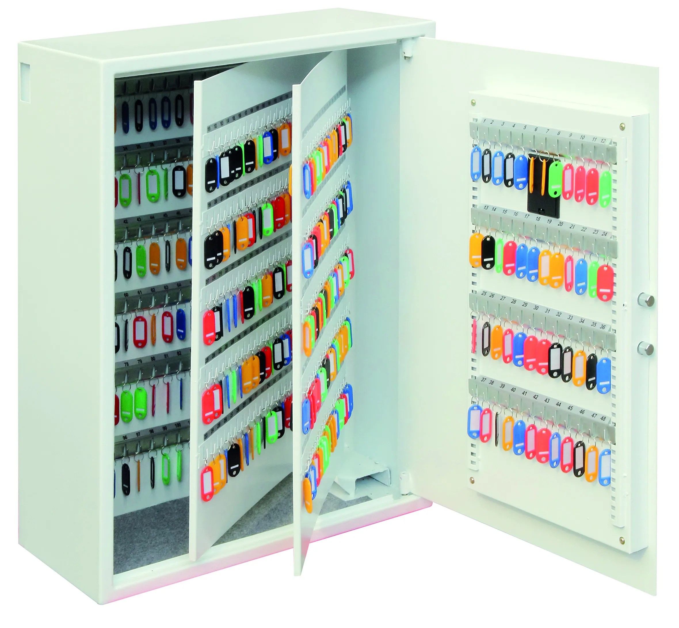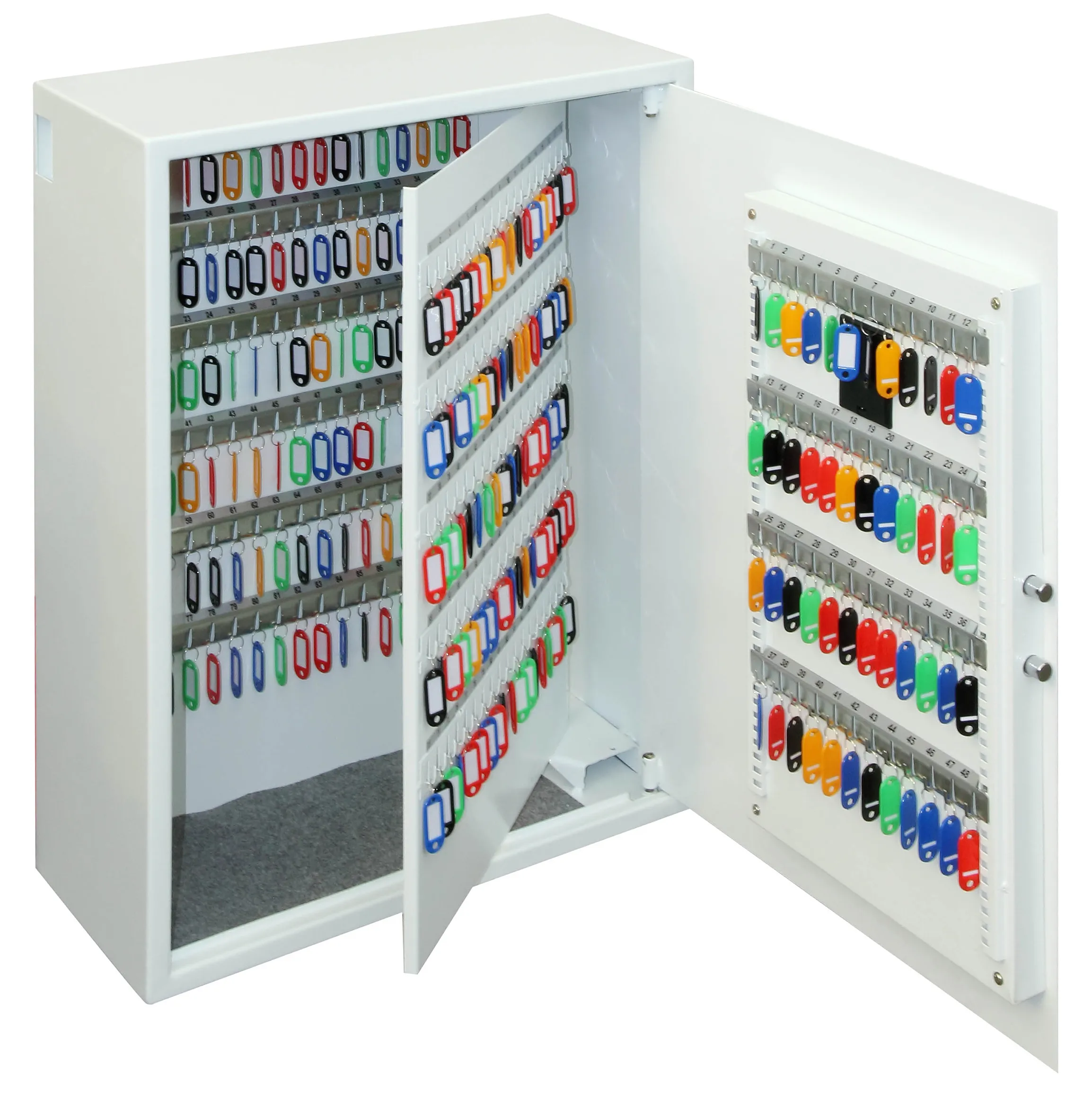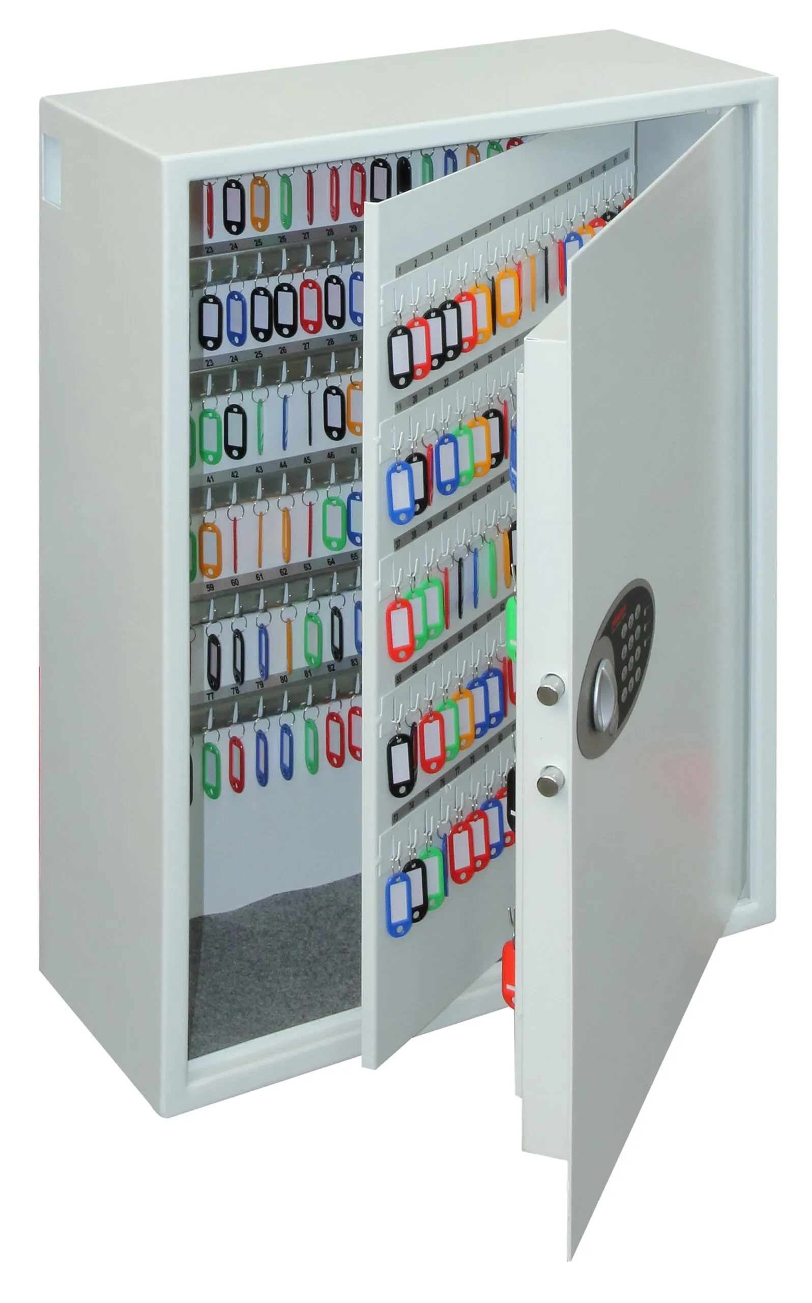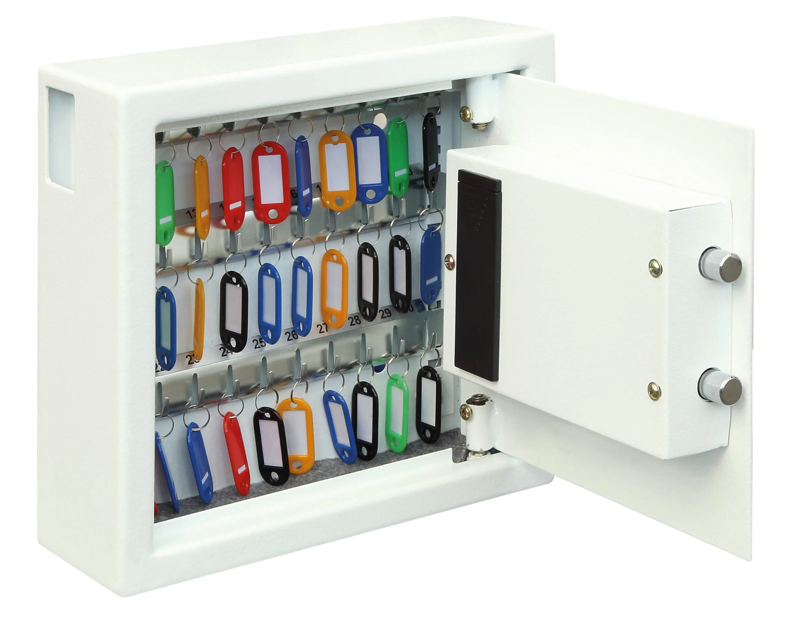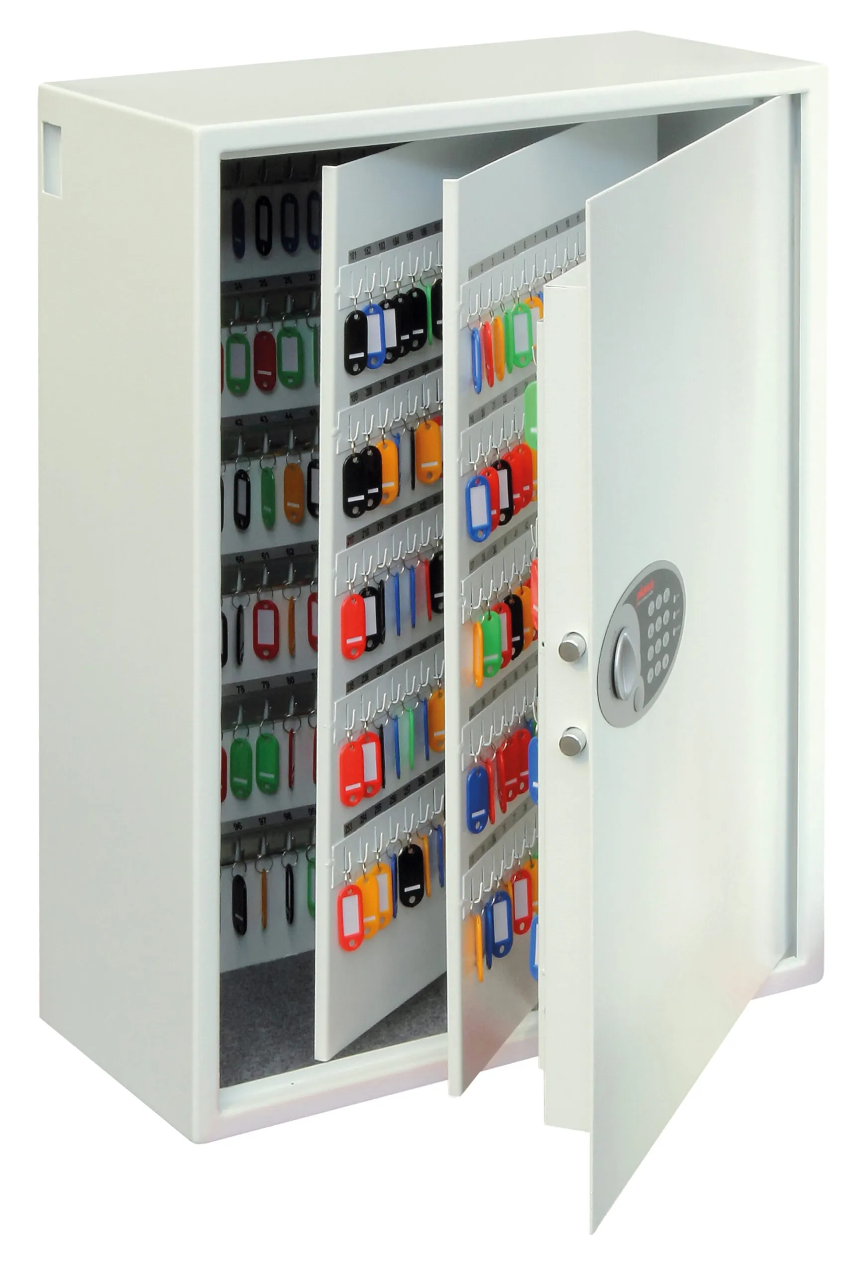 NO OF KEY HOOKS – 30, 48, 144, 300, 500 or 700 | LOCKING – Fitted with an advanced ‘user friendly’ electronic locking with anti-tamper or bounce solenoid locking System. For added peace of mind these safes are fitted with a key override facility should the code be misplaced (2 Keys supplied). | SECURITY – When bolted to a wall these key Safes provide defence against burglaries aimed at stealing car keys, house keys, office keys etc | FIXING – Ready prepared for fixing to the wall with bolts supplied | SPECIAL FEATURES – A unique key deposit slot allows keys to be deposited without the need to open the safe | DEPOSIT SLOT – 55H x 35W x 15Dmm | KEY TAGS – Supplied complete with a selection of coloured key rings | COLOUR – Finished in a high quality scratch resistant paint RAL9003 White.
